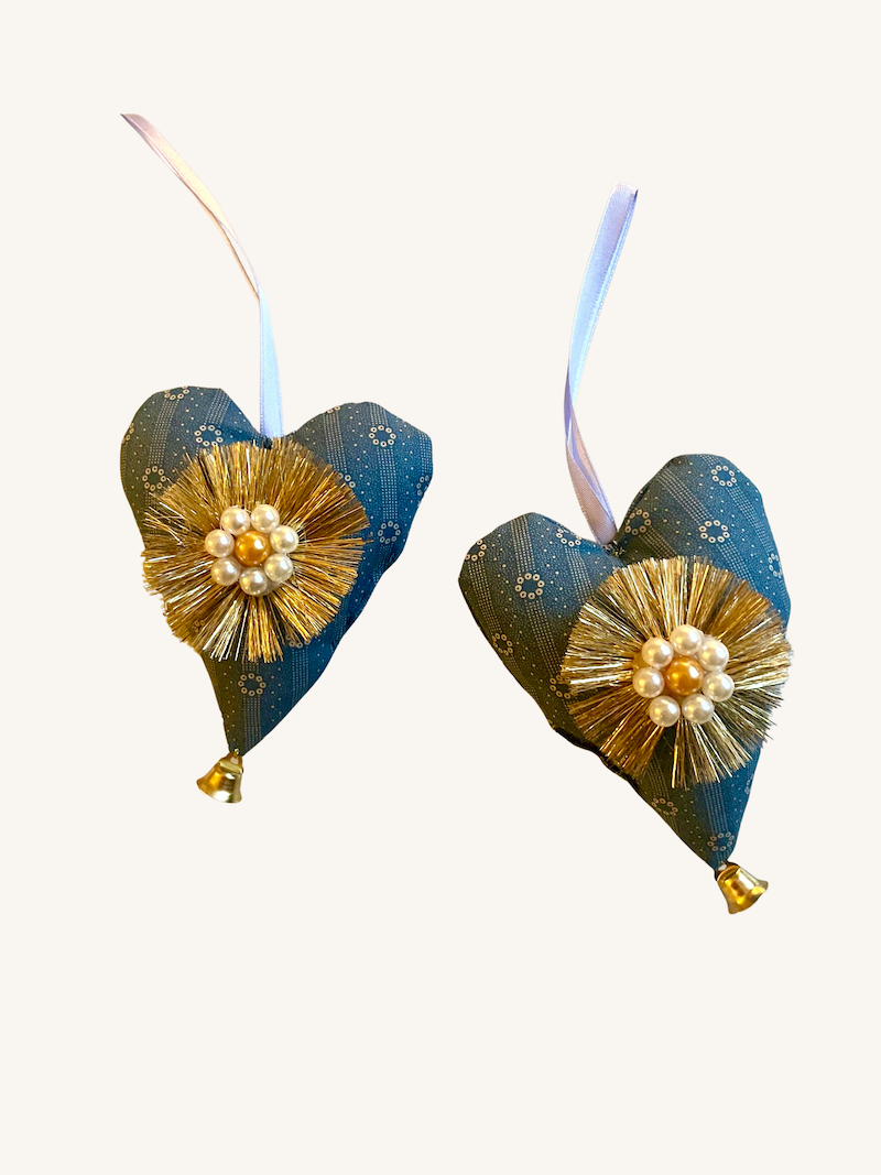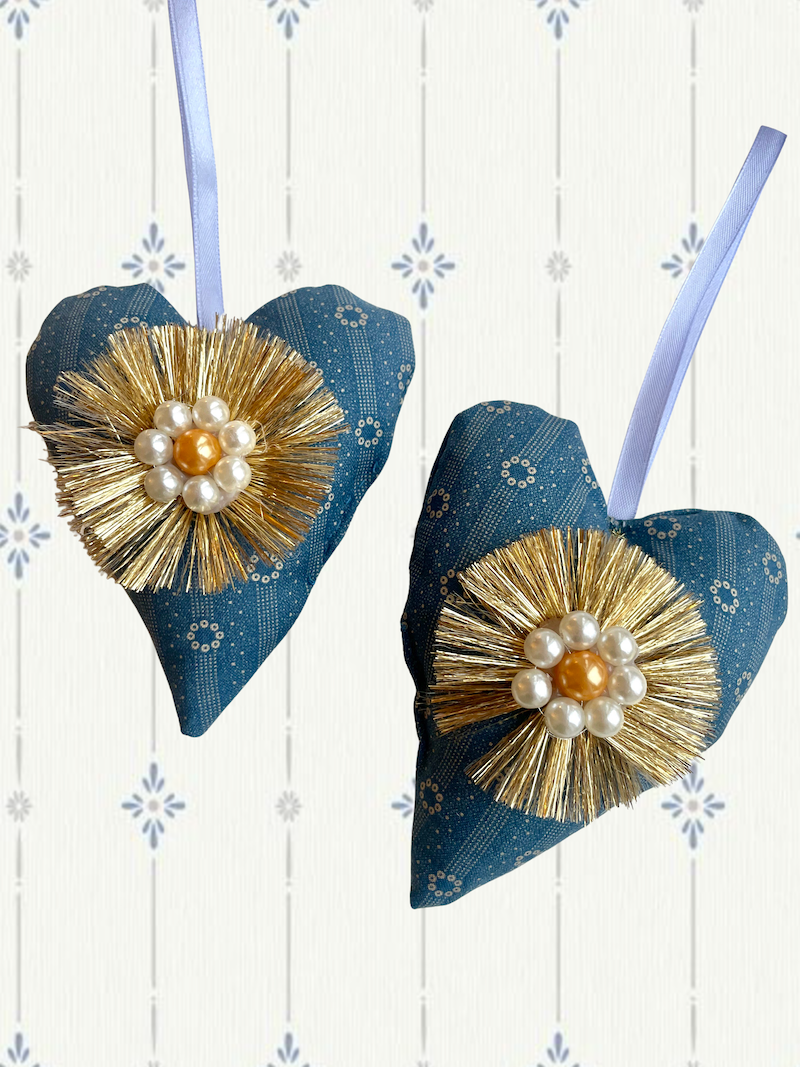 Hjerte i blåt stof med elegant mønster, guld rosette og håndlavet perleblomst.