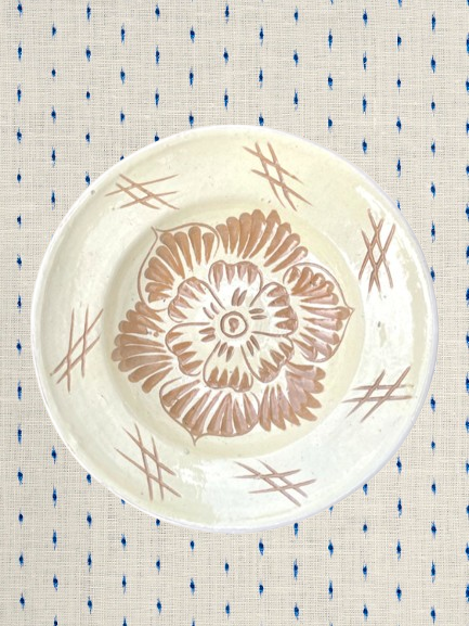 Håndmalet unika skål med mulighed for ophæng bagpå. Dekoreret med et fint mønster med grønne nuancer og jordfarver. Brug den til servering eller som dekoration på væggen sammen med rammer og andre værker. Keramikken er håndlavet i Rumænien, hvor de har en lang og stolt tradition for keramik.