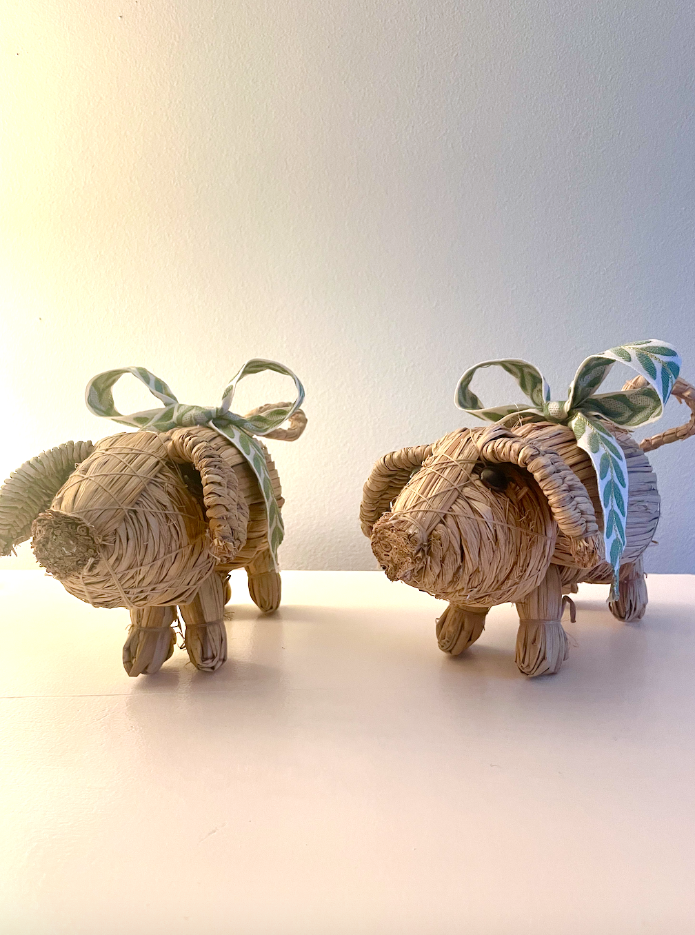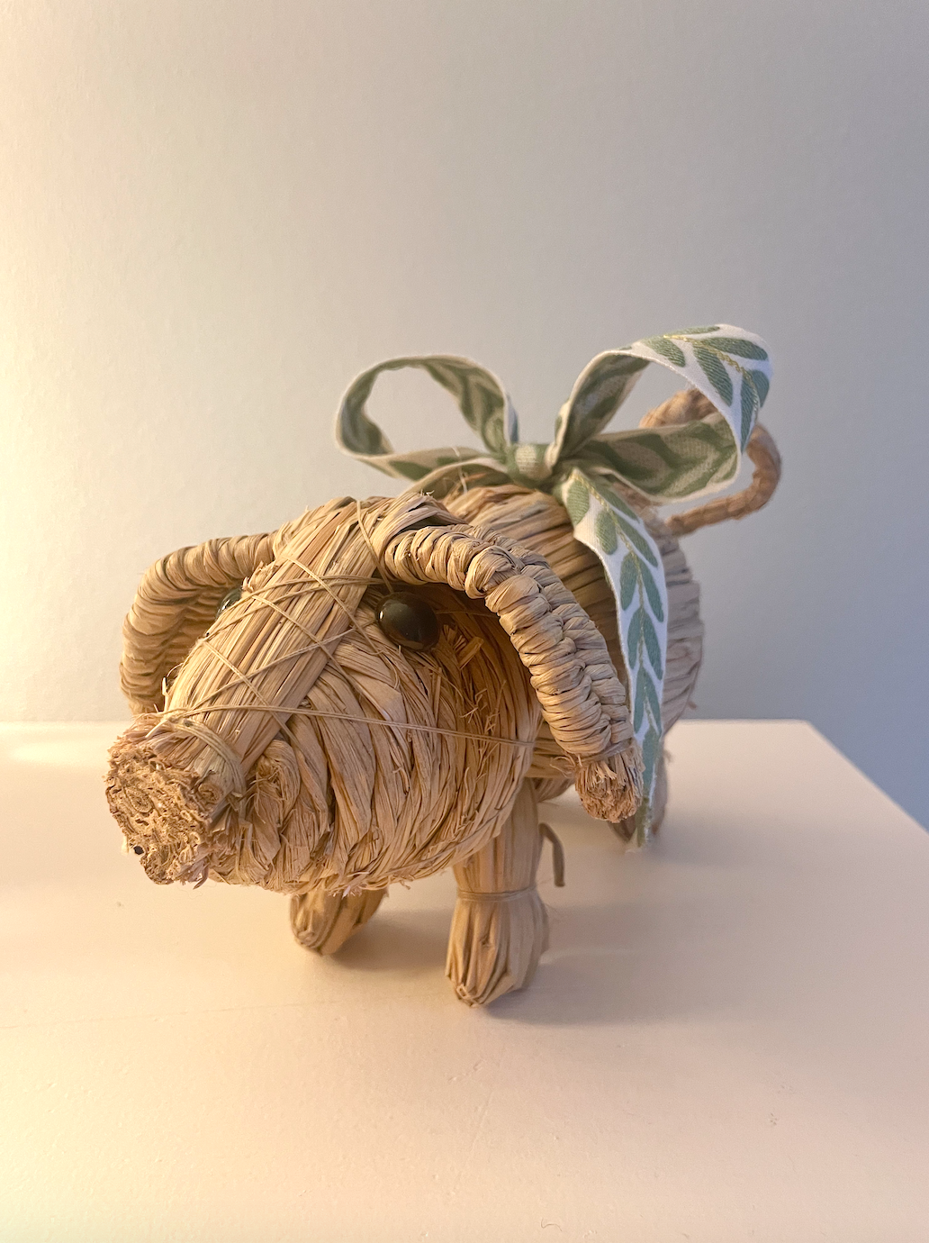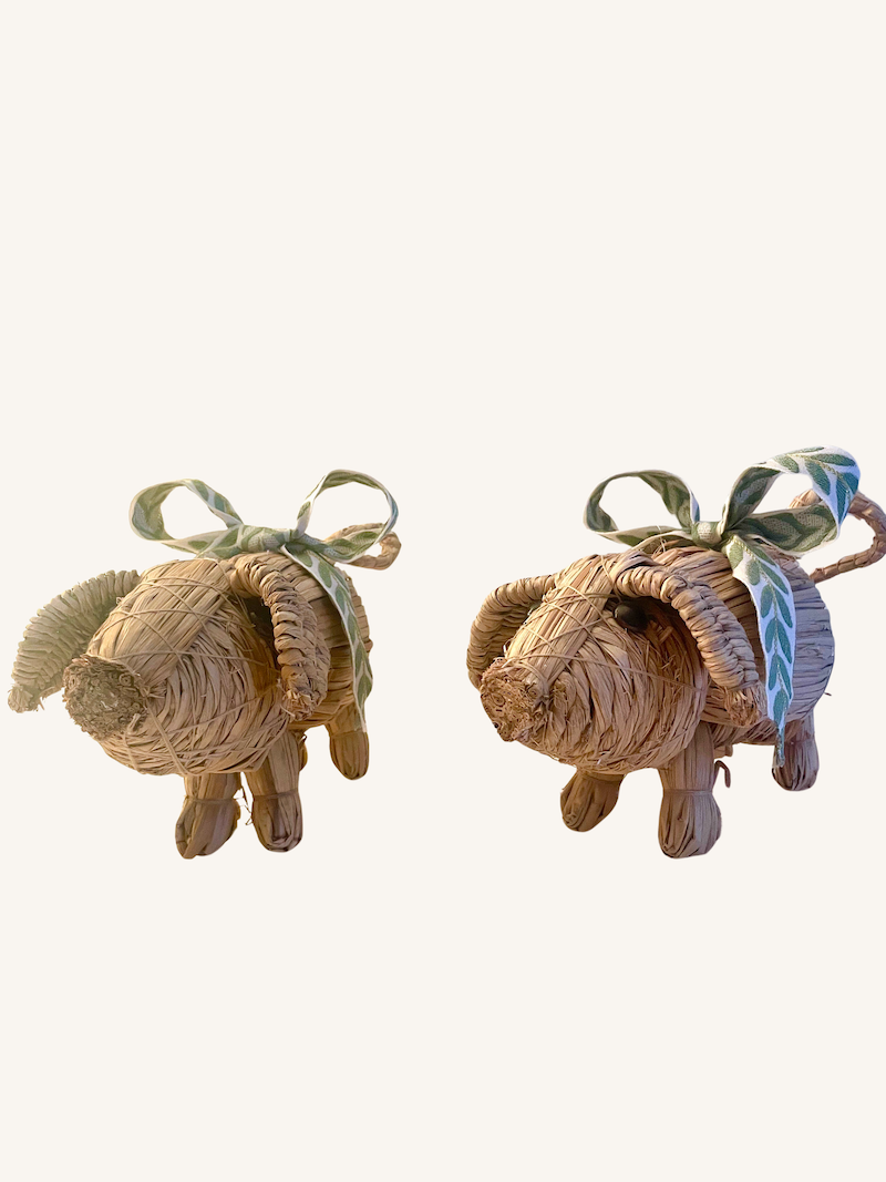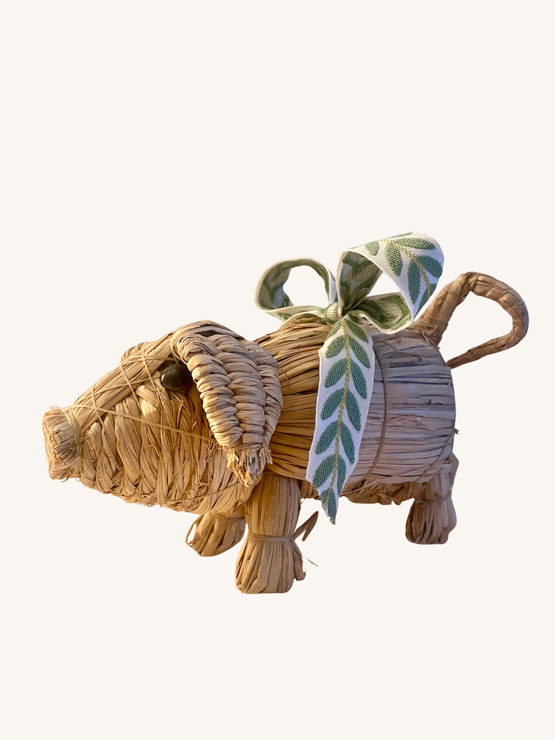 Nostalgisk og stemningsfuld gris i halm med sløjfe. Den giver den helt rette og hyggelige stemning her i julen.