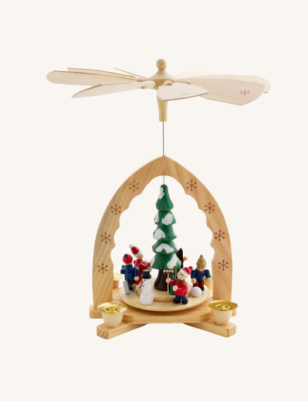 De smukt udskårne pyramider blev oprindeligt skabt i Erzgebirge-regionen, kendt for sit unikke håndværk og fine træarbejde. Inspireret af naturens former og julenattens symbolik blev de brugt til at lyse hjemmet op i vintermørket og skabe en varm og festlig atmosfære. Plads til fire kertelys, der får karrusellen til at dreje rundt.