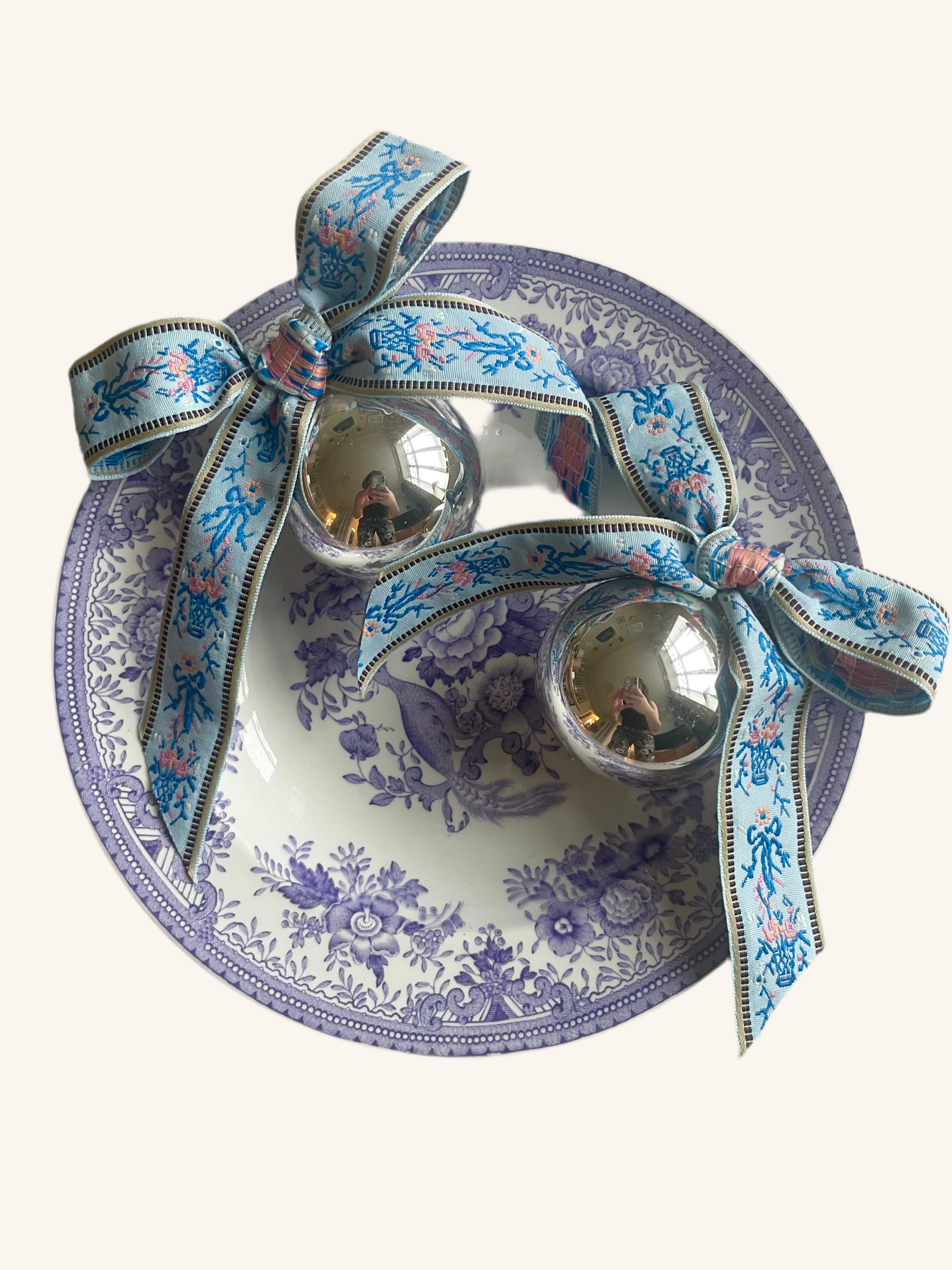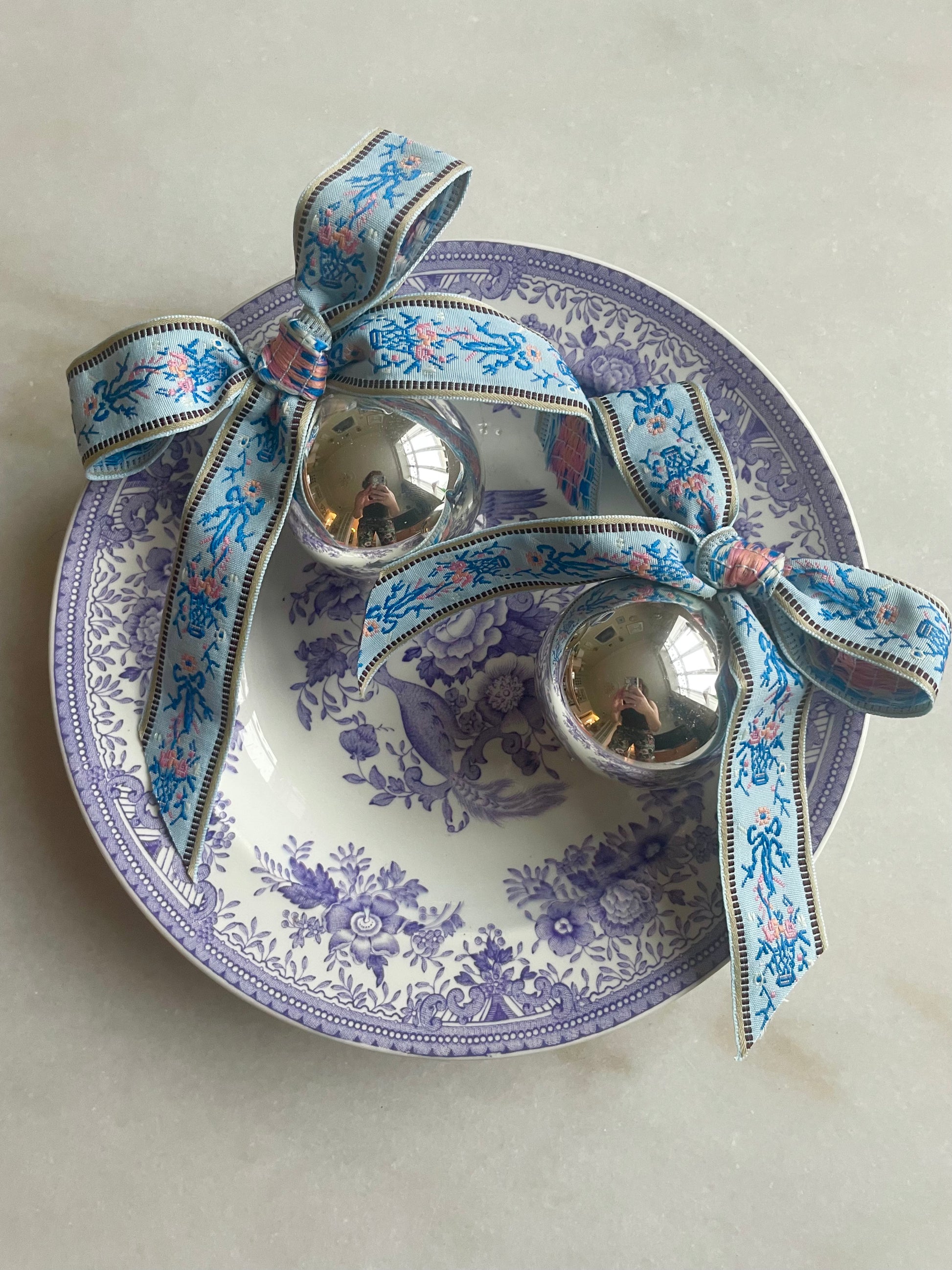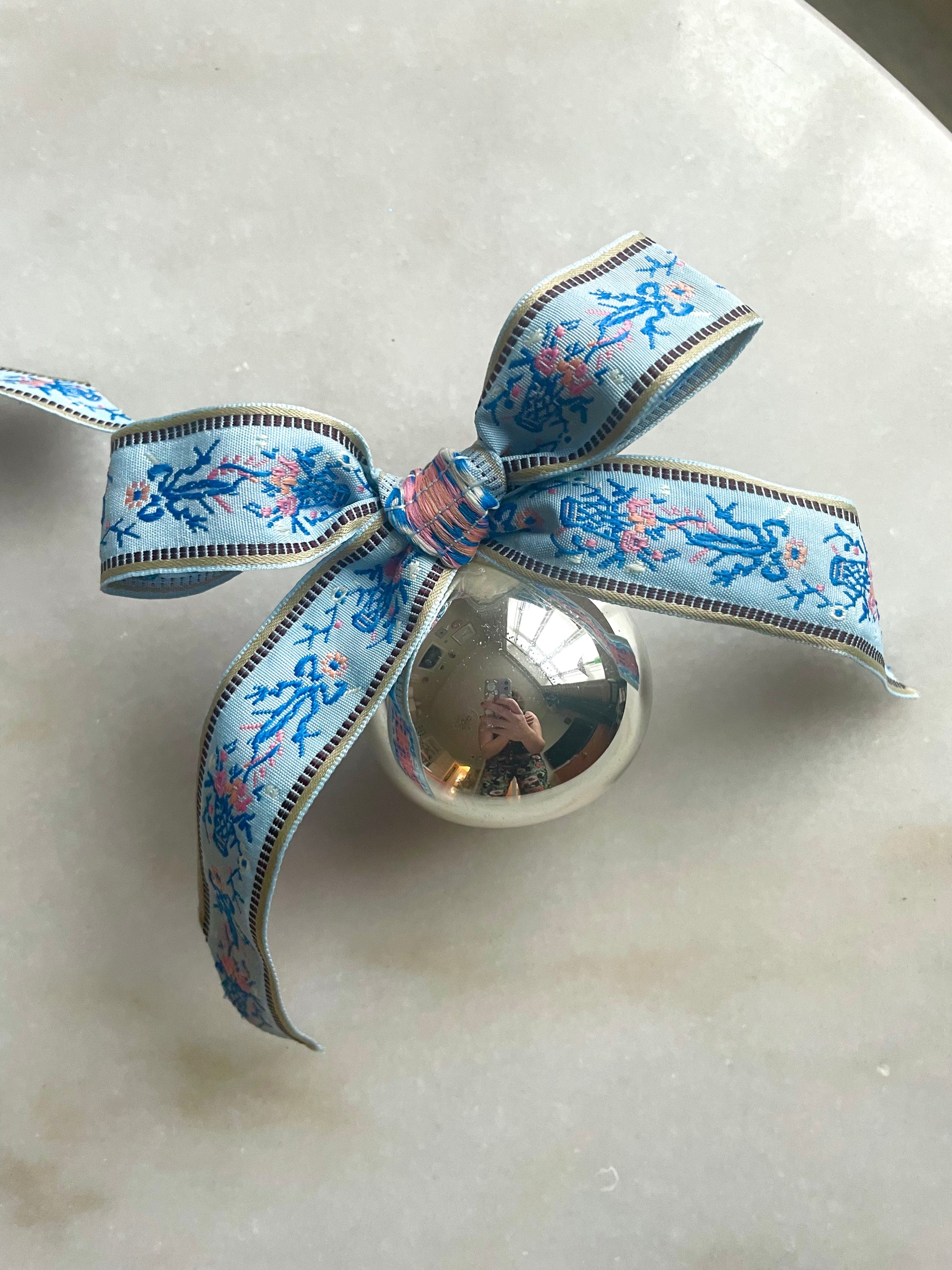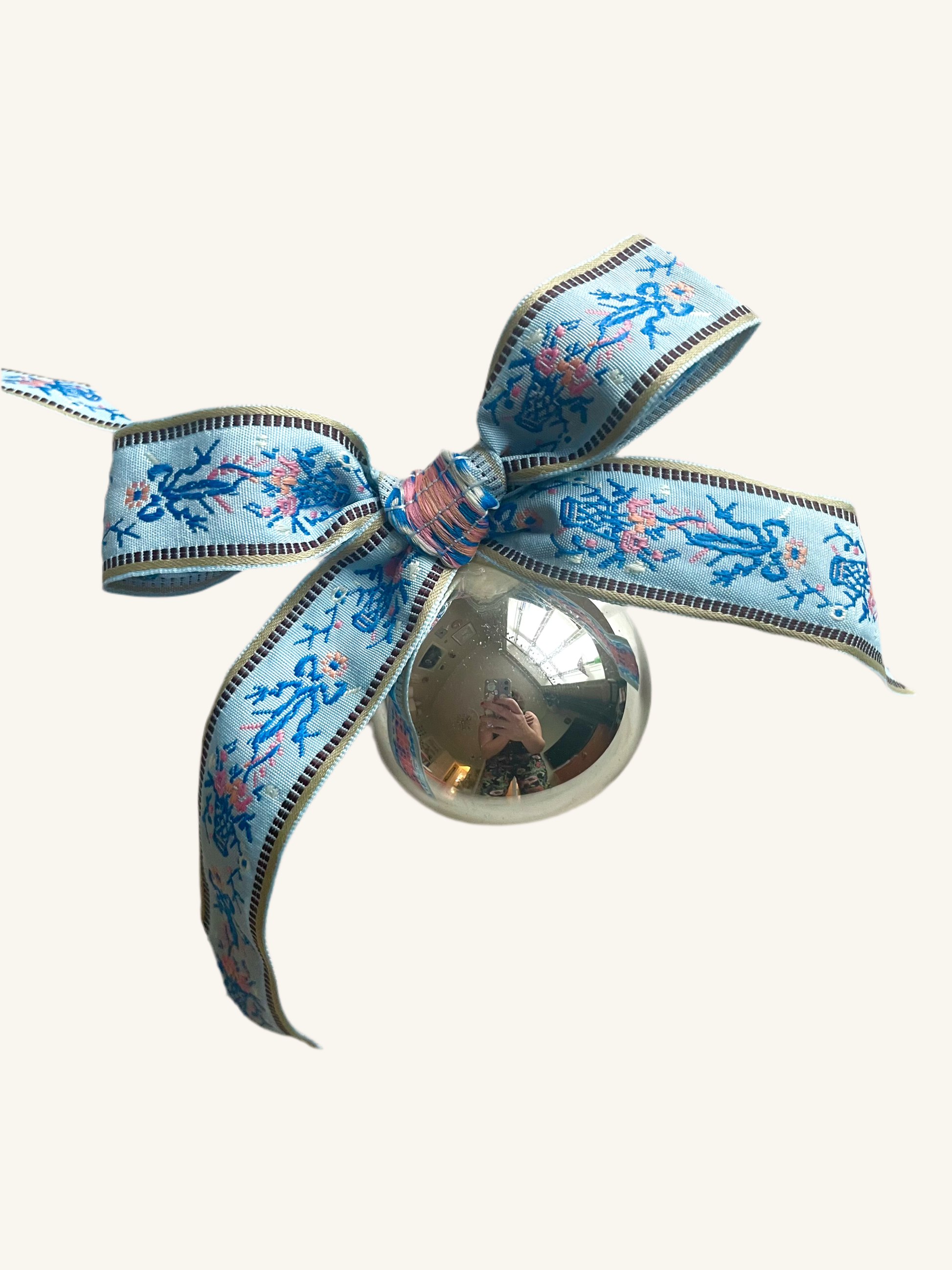 Pynt dit juletræ med de smukke vintage julekugler i blankt sølvfarvet glas og smukt bånd. De er ubrugte og fra 1970’erne.
