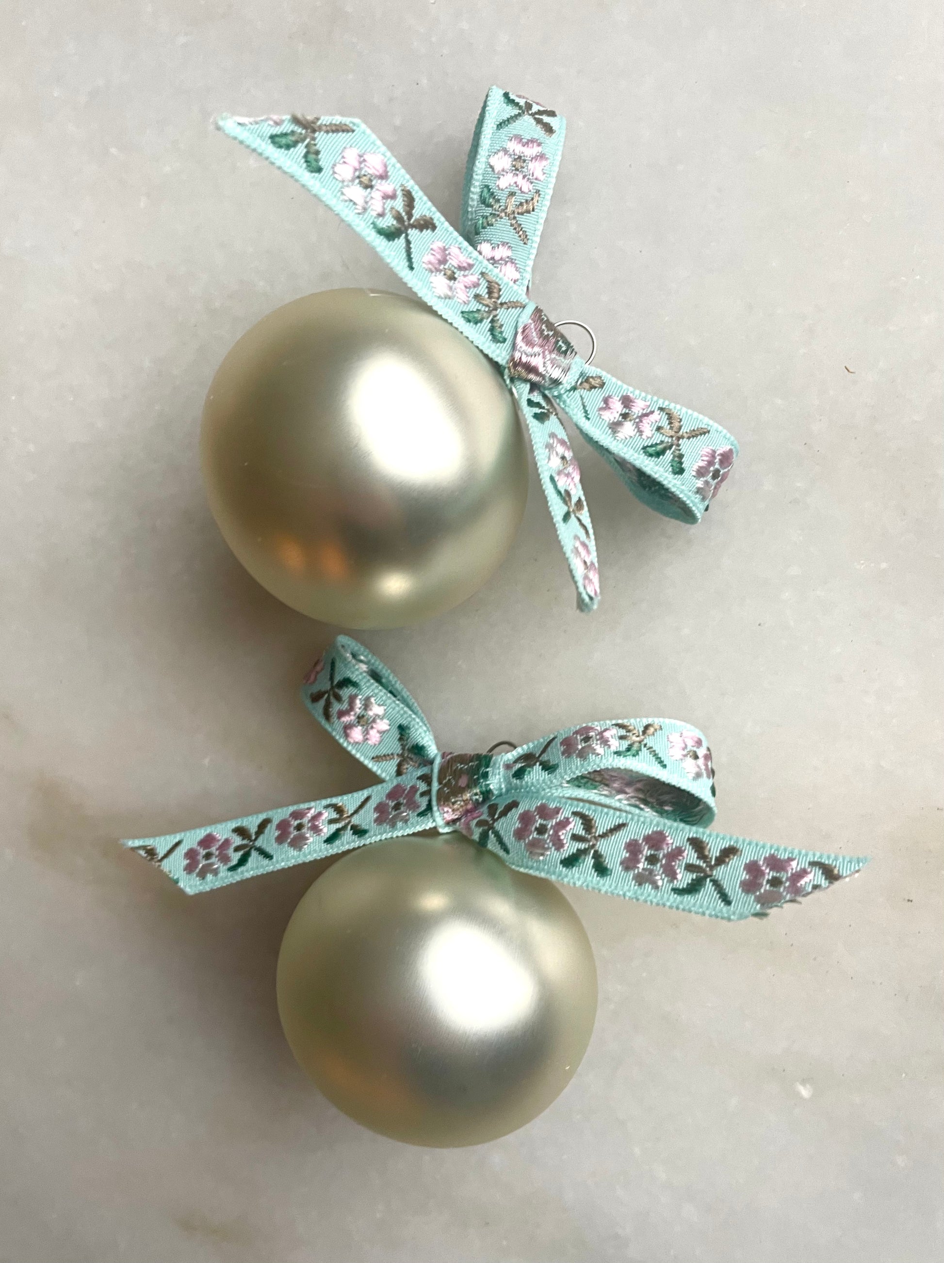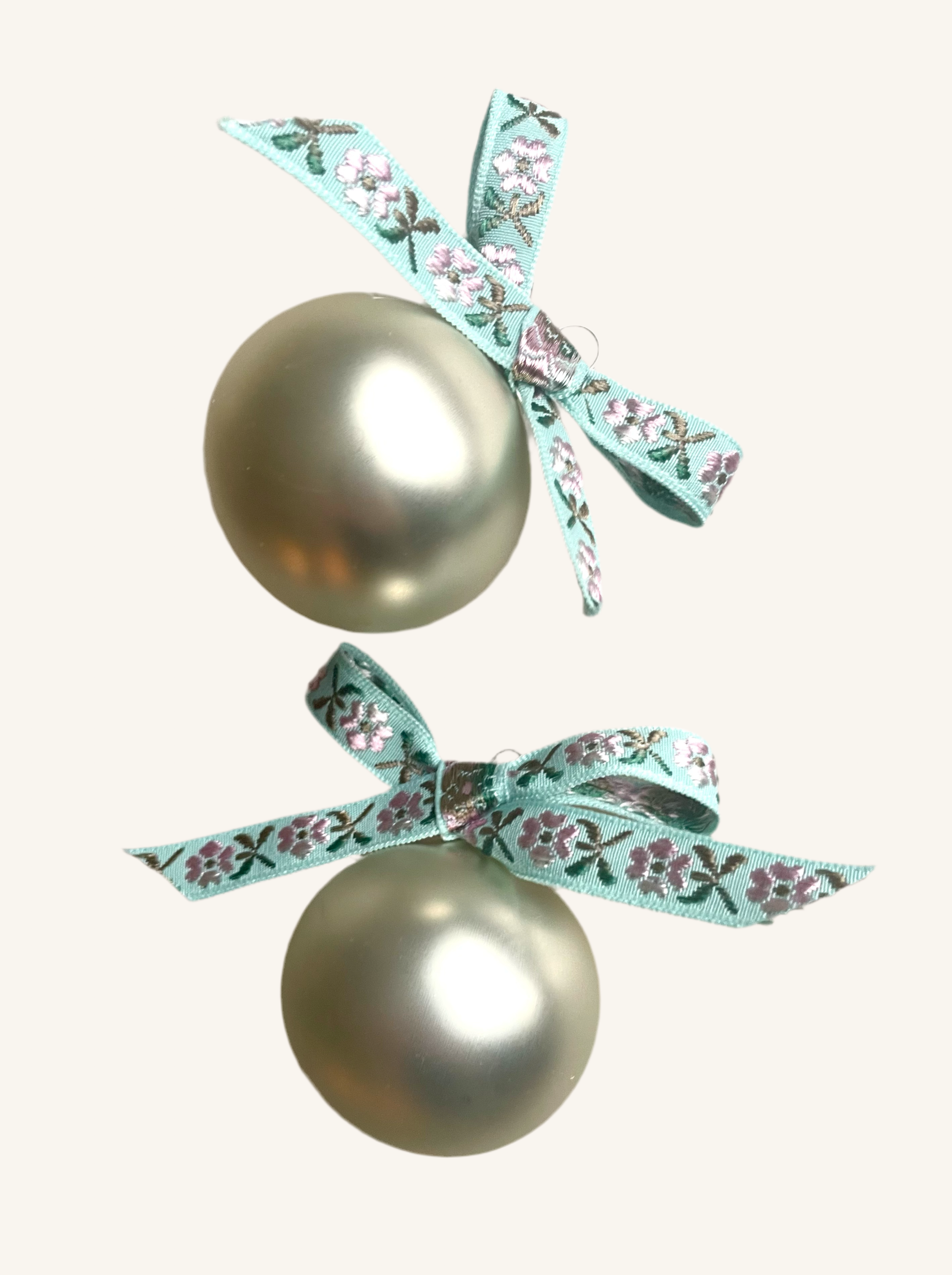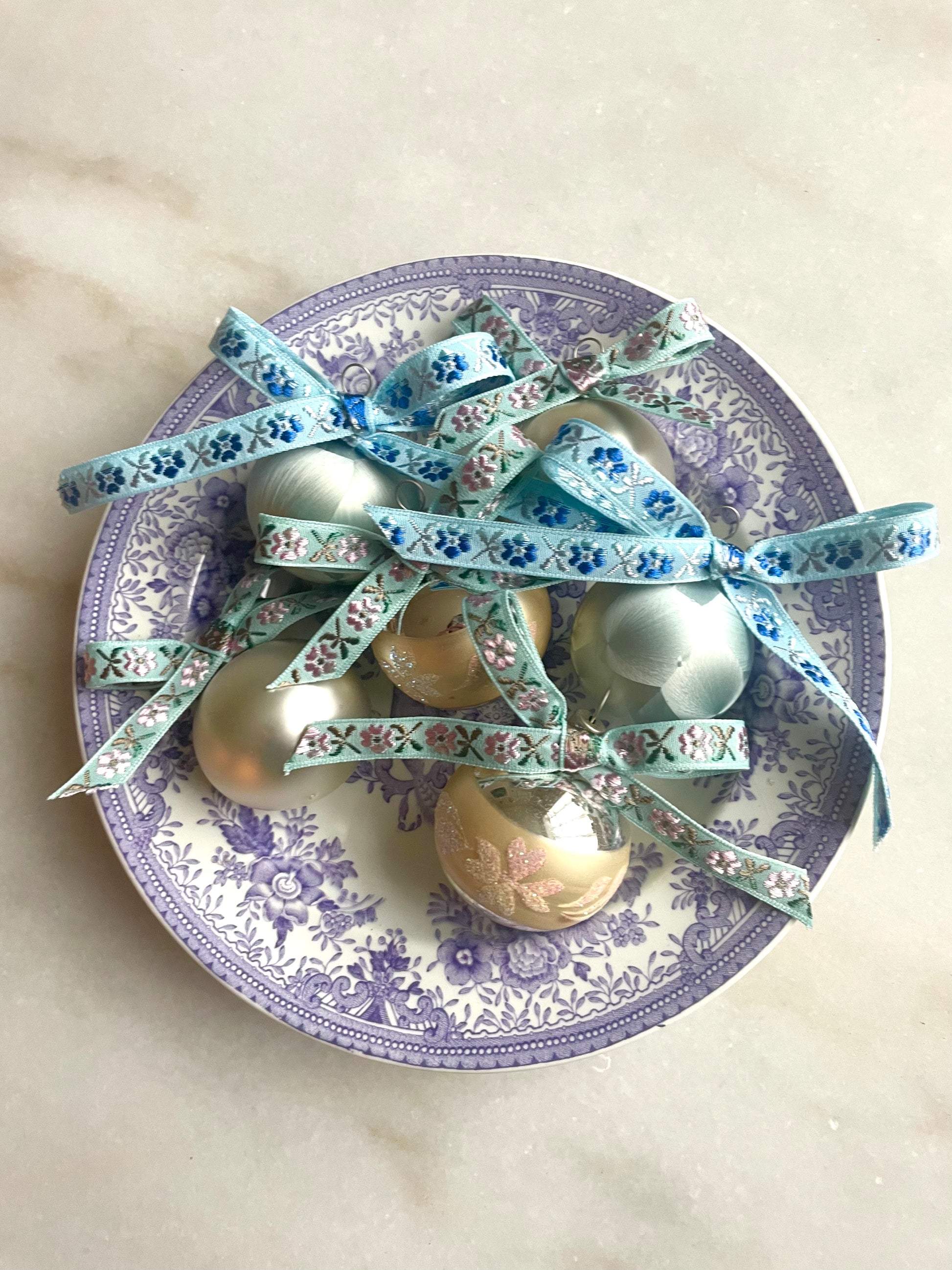 Pynt dit juletræ med de smukke vintage julekugler i glas og smukt bånd. De er ubrugte og fra 1970’erne.