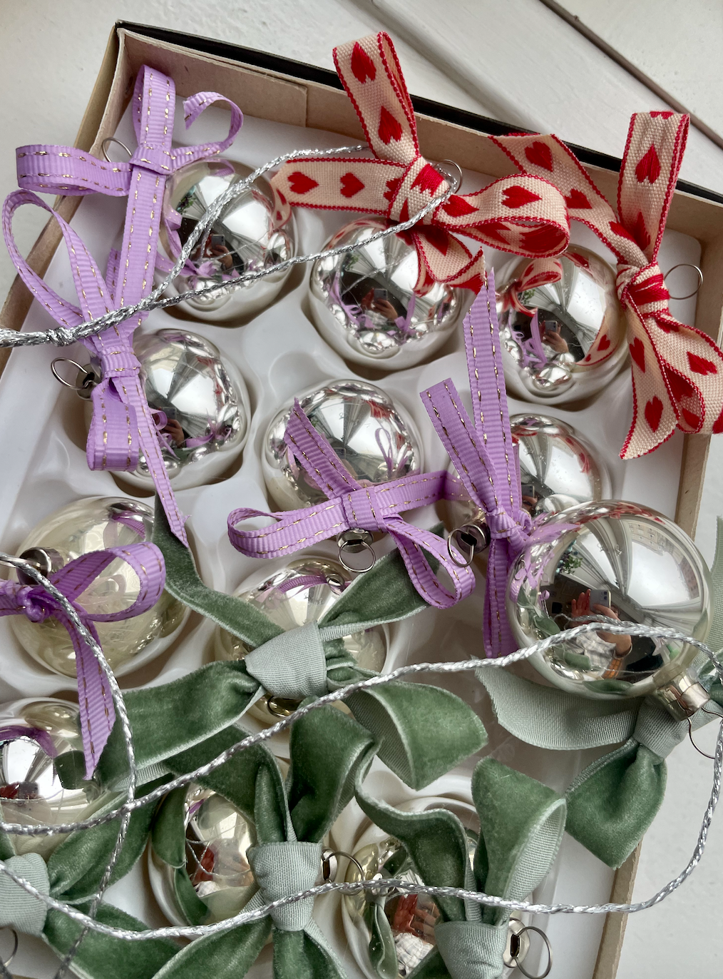 Pynt dit juletræ med de små vintage julekugler i sølv farve med bånd. De er formgivet i plast, så de er børnesikre. Jeg elsker selv at indrette med gammel julepynt, da det bringer nostalgi og charme ind i hjemmet. At pynte med julepynt er som at bringe et stykke historie og tradition ind i julen – perfekt til dem, der elsker et klassisk og nostalgisk udtryk.